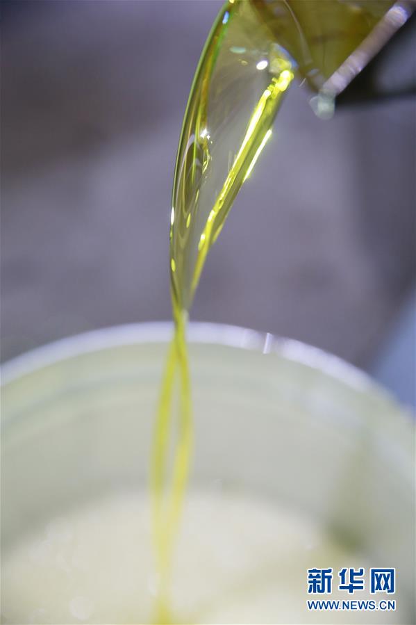 11月22日,在广西柳州三江侗族自治县斗江镇一茶油加工点,新榨的茶油从榨油机流出。新华社记者任正来摄