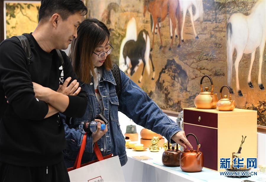 11月23日,两位参观者在“博博会”上观看文创产品。新华社记者李贺摄
