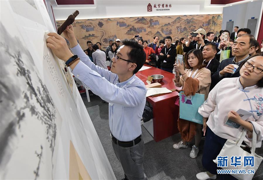 11月23日,来自故宫博物院的技师现场展示书画装裱技艺。新华社记者李贺摄