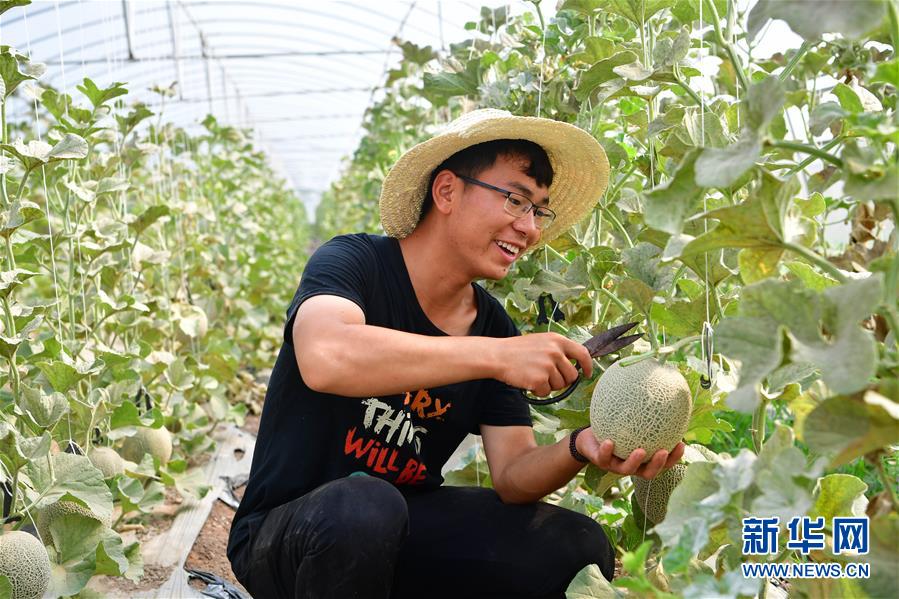 在河南兰考县东坝头乡张庄村,一位农民在塑料大棚中采摘兰考蜜瓜(6月20日摄)。新华社记者冯大鹏摄