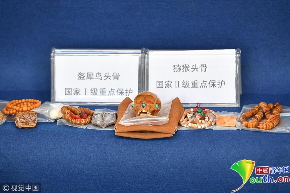 11月23日,现场展示警方查获的野生动物制品。当日,昆明市森林公安局向媒体通报,破获一系列特大非法收购出售珍贵濒危野生动物及其制品案件。