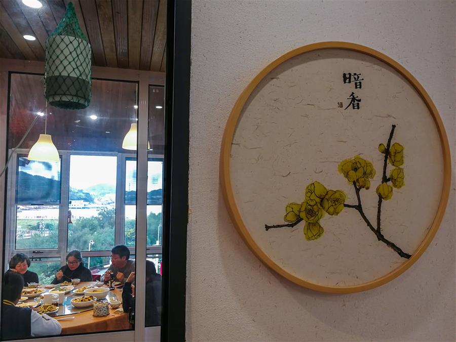 12月15日,客人在朱家尖乌石塘“渔夫客栈”民宿包厢内用餐,该民宿有海景房7间,餐饮包厢8个。 新华社记者 徐昱 摄