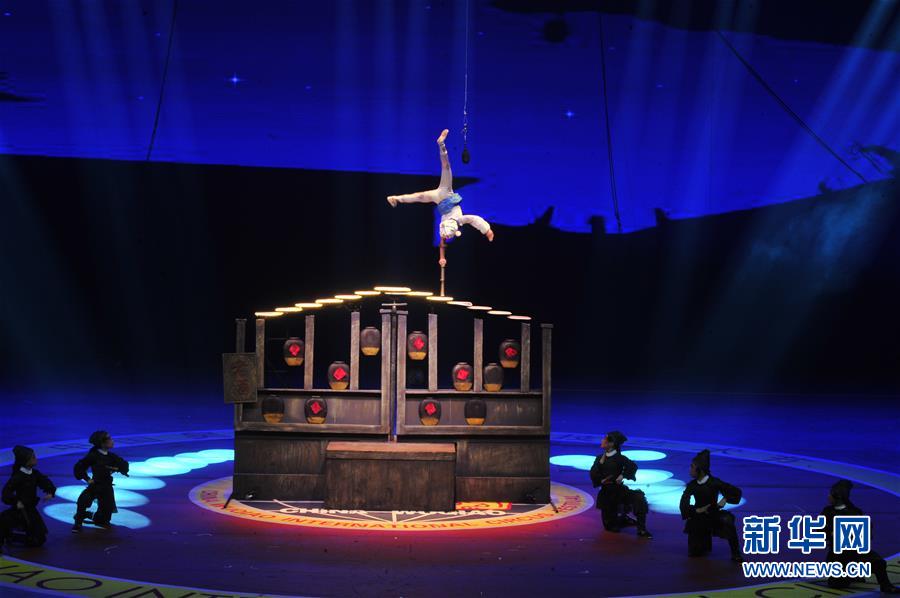 11月3日,河北省杂技团演艺有限公司演员在表演《“生丑炫技”——倒立》。 新华社记者 牟宇 摄