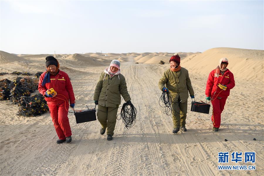 1月14日,4名测线女工抬着电瓶返回营地。地球物理勘探是油气开发的第一步,相当于给地球做CT。物探工人按照严格的测线部署,在相应位置钻井,然后实施地震,采集地震波数据。科研人员通过数据组成的“CT片”,就能够清晰地“看”到地下的地质结构,判断哪里埋藏有石油或者天然气。2019年10月,东方地球物理勘探有限责任公司塔里木物探处2113队进入新疆塔克拉玛干沙漠腹地,开始中古14-21、塔中2两个区块的三维地震勘探。近2000名物探工人将在1000平方公里的范围内一直工作到2020年4月,这也意味着他们将在塔克拉玛干沙漠腹地连续度过第14个除夕夜。蕴藏着丰富石油天然气资源的新疆塔克拉玛干沙漠有“死亡之海”之称,气候干燥,年降水量在50毫米以下,冬季地表最低温度超过零下30摄氏度,是世界油气勘探难度最大的地区之一。为避开风季,物探工人每年9、10月份进入沙漠,一直工作到来年4月,夜以继日与黄沙、严寒为伴,用辛勤的汗水,为祖国找油找气。新华社记者丁磊摄