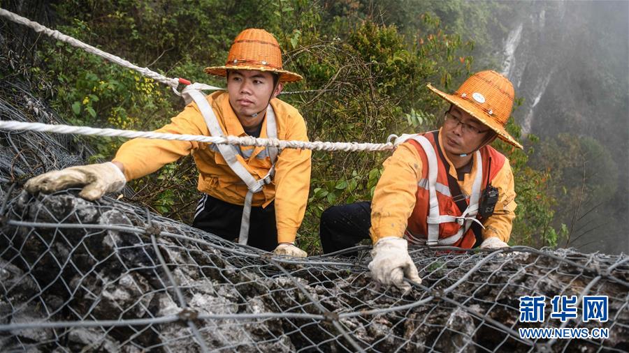 1月14日,百色工务段白水河桥隧工区班组工长王勇(右一)和同事在处理危石。在中国铁路南宁局集团公司百色工务段白水河桥隧工区,有一个由14名工人组成的班组。他们常年像“爬山虎”一样行走攀爬在地形险峻、云雾缭绕的高山上,负责南昆铁路辖区路段的搜山扫石工作,清除一切可能危害铁路行车安全的因素,保障旅客出行安全。新华社记者张爱林摄