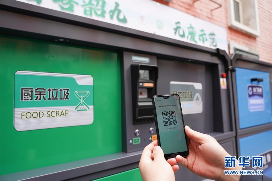 5月17日,在东华门街道韶九社区,工作人员在展示用于垃圾分类投放和积分的二维码。新华社记者鞠焕宗摄