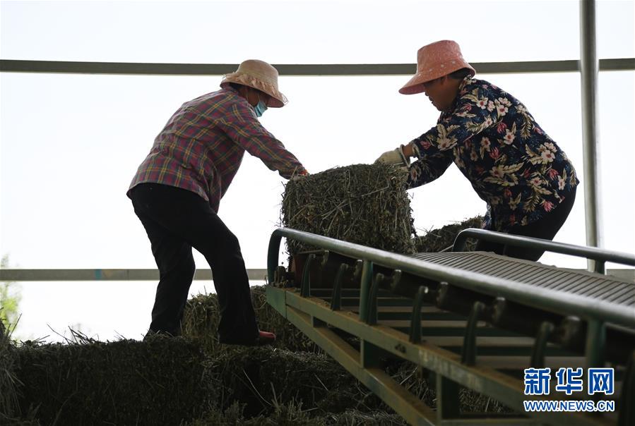 在平顶山市叶县常村镇月台村扶贫车间仓库,村民整理打好捆的艾草(5月27日摄)。