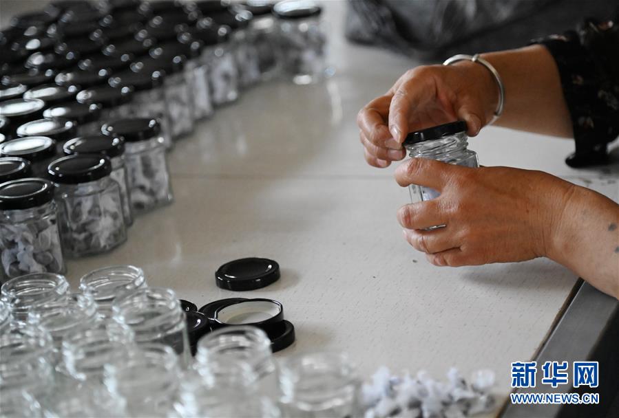 在平顶山市叶县常村镇月台村扶贫车间,村民在包装艾草制品(5月27日摄)。新华社记者张浩然摄