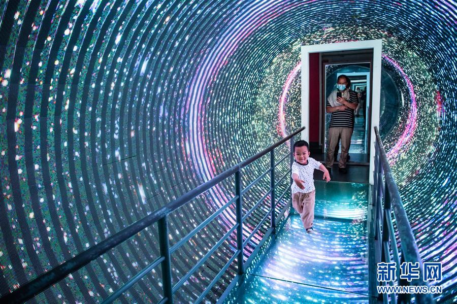 6月1日,小朋友在贵州科技馆内体验“时光隧道”。
