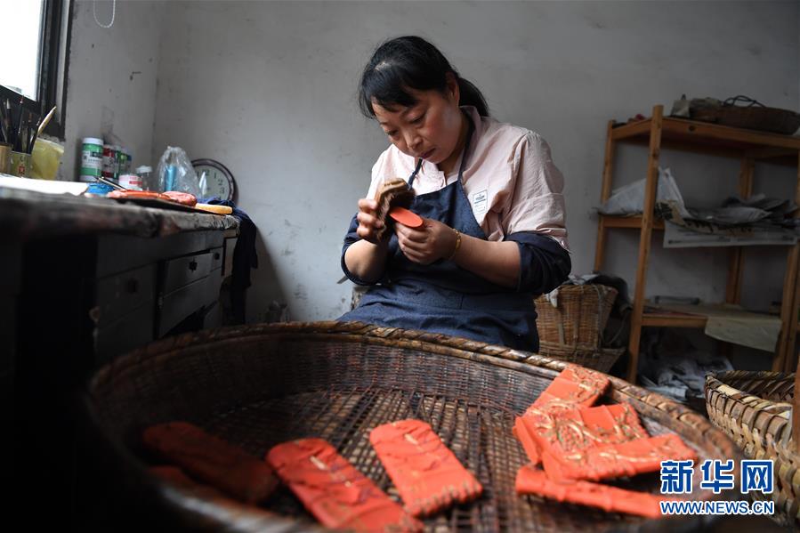 5月20日,安徽歙县“项氏徽墨”的工人为墨打蜡。新华社记者刘军喜摄。