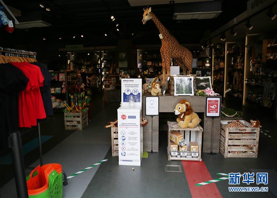 6月9日,法国巴黎动物园的纪念品商店入口处为游客提供消毒免洗洗手液,并在地上标注了参观方向。受新冠疫情影响关闭了近3个月的巴黎动物园于8日重新开放。新华社记者高静摄