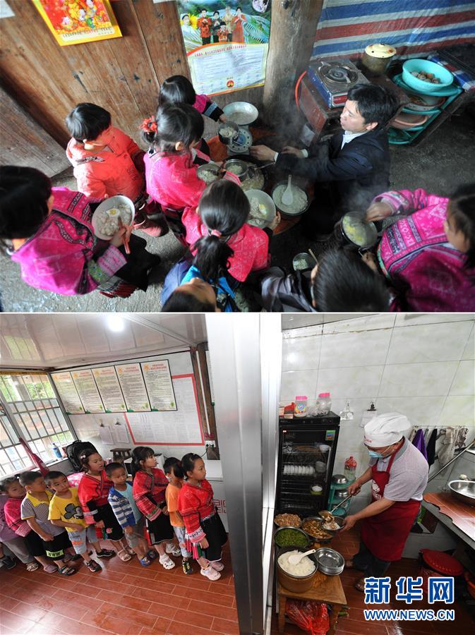这是一张拼版照片,上图:在广西龙胜龙脊镇江柳村翁江小学,余启贵老师在给学生盛午饭(2013年2月26日摄);下图:在广西龙胜龙脊镇江柳村翁江小学,余启贵老师在给学生盛午饭(7月7日摄)。新华社记者陆波岸摄