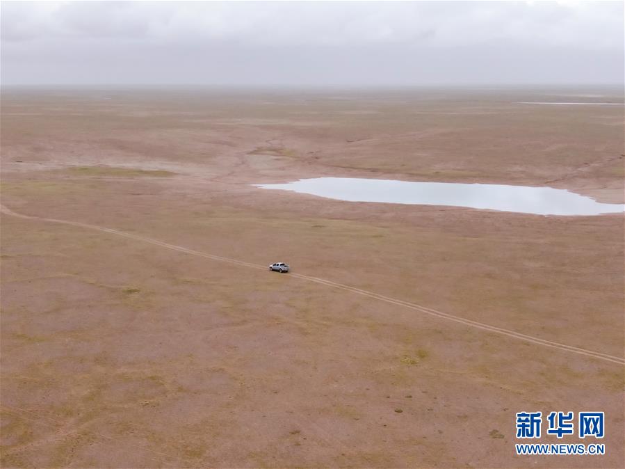 在可可西里索南达杰保护站管护区域,龙周才加与队友们乘车巡视(6月30日摄,无人机照片)。新华社记者 张龙 摄