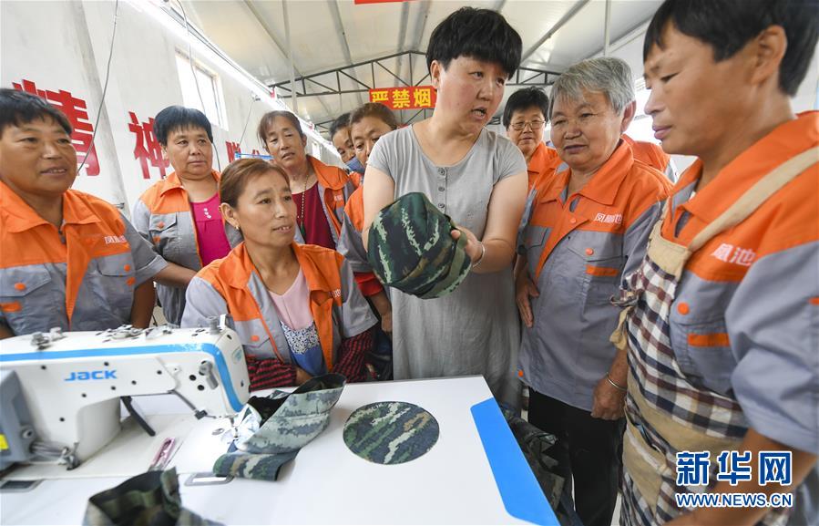 7月16日,在河北省深州市高古庄镇凤凰池村扶贫车间,马京娜指导车间工人加工帽子。马京娜是河北省深州市高古庄镇凤凰池村的致富能手。在市、乡、村各级部门的大力支持下,马京娜创办扶贫车间,为建档立卡贫困户设立岗位,带领贫困户脱贫增收。目前,马京娜的扶贫车间提供就业岗位30多个。新华社记者李晓果摄