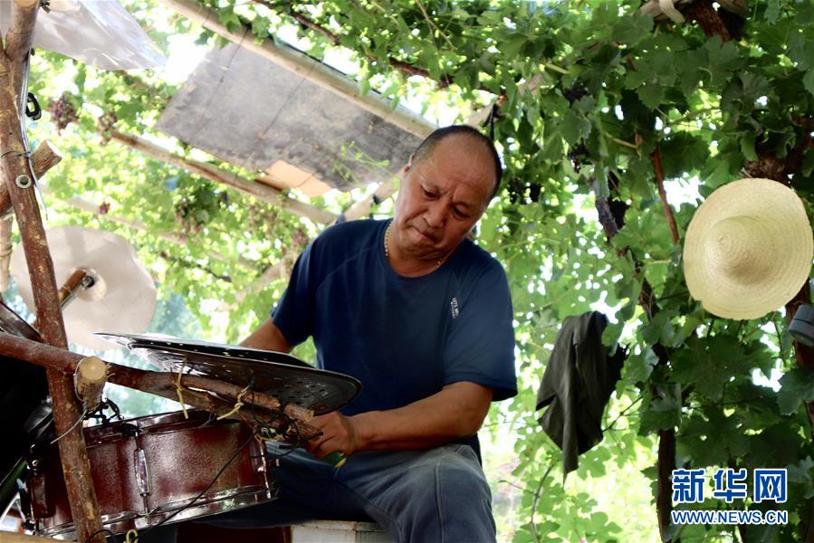 张宏远在位于新疆玛纳斯县的自家院落里维修自制的架子鼓(7月14日摄)。新华社记者孙哲摄