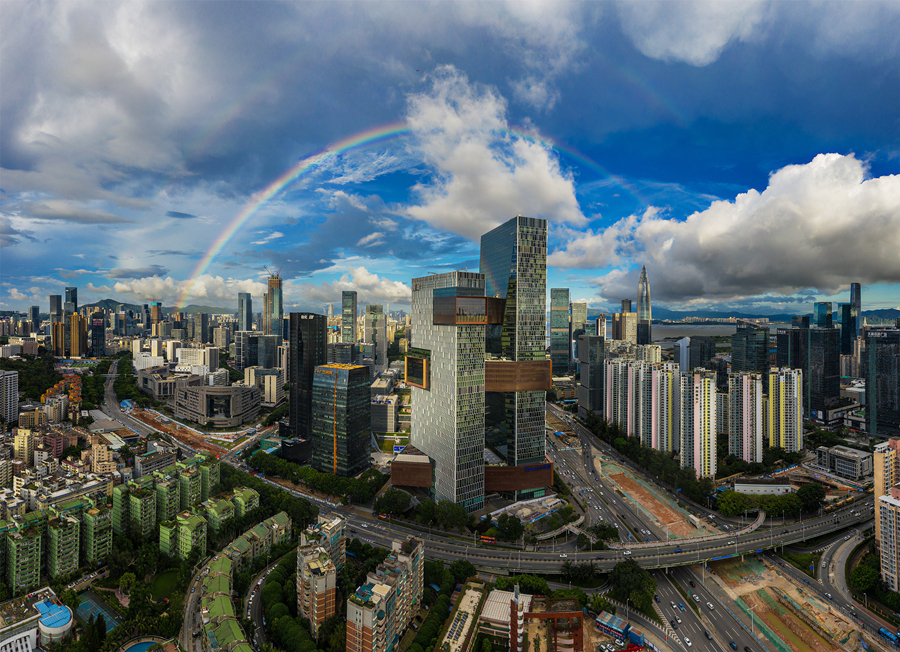 2019年8月29日傍晚,雨后的深圳湾出现双彩虹,图为腾讯滨海大厦上空的彩虹。
