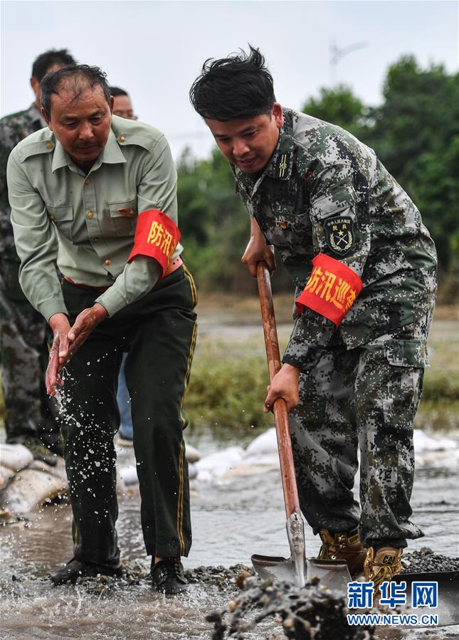 7月18日,陈申桃(左)和儿子在东升堤附近处理一起泡泉险情。新华社记者胡晨欢摄