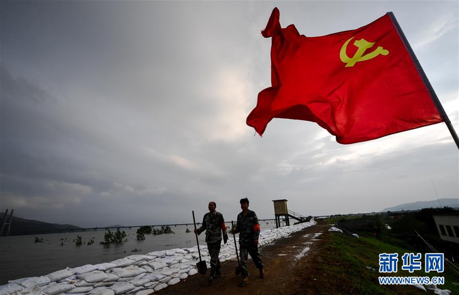 7月19日,傍晚时分,陈申桃(左)和儿子在圩堤上行走。新华社记者胡晨欢摄