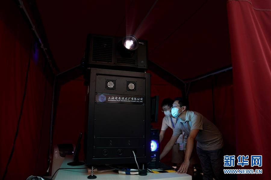 7月25日,在上海大宁音乐广场的露天电影展映现场,放映人员在工作。新华社记者 刘颖 摄