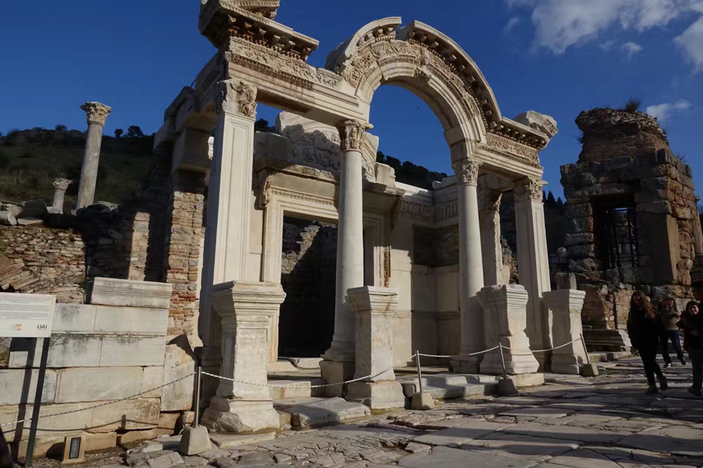 哈德良神庙就在图书馆斜对面,是典型柯林斯式神庙的代表,内墙廊柱上有不同神话人物的雕刻,拱门上有精美的浮雕,前侧拱门上是幸运女神的头像,内侧拱门上是张开双臂的蛇发女妖美杜莎的雕像。李仁奇 摄