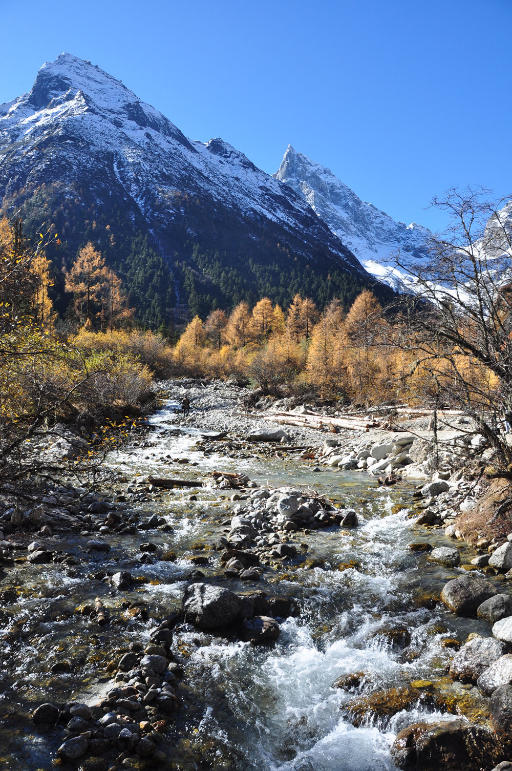 从雪山上流淌下来的小溪,在雪山和蓝天的映衬下,分外漂亮。李仁奇 摄