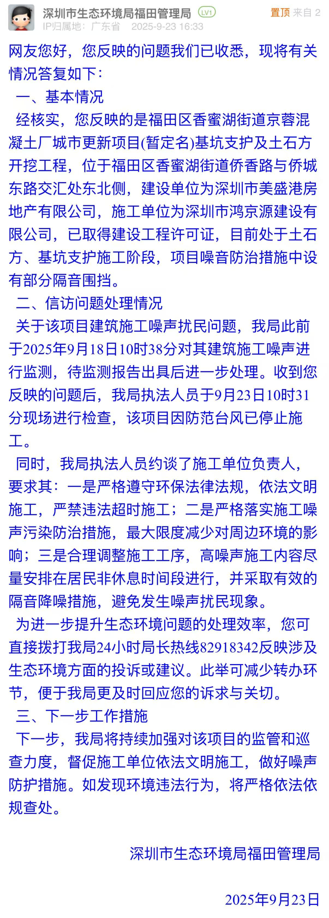 优化建议:在诉求中,市民表示施工噪音可以忍耐,但希望“灰尘大”情况可以得到缓解,并附图展示现场情况。市生态环境局福田管理局在回应中,仅聚焦建筑施工噪声,对“灰尘污染”只字未提,与市民诉求脱节。建议后续提高诉求匹配度,用务实的态度回应市民对居住环境、城市建设的关切,避免因回应不完整引发新的治理信任问题。